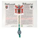 Historical NoteThe illuminated coat of arms given to President John F. Kennedy by Thomas J. Kiernan, Irish ambassador to the U.S., at the White House on St. Patrick’s Day 1961 was a departure from previous gifts from Ireland to U.S. heads of state. At Kiernan's request on behalf of the government of Ireland, the Office of Heraldry in Dublin prepared a special "earned" coat of arms for the President. An earned coat of arms was created, as Kiernan explained, when “a man had done something exceptional for his people.” Kennedy’s coat of arms is based on ancient heraldry from the O’Kennedy and Fitzgerald families combined with a new element--a raised arm grasping a bundle of arrows at the top representing the Kennedy presidency.