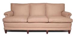 Physical DescriptionPink upholstered davenport (sofa) with low arm rests, three seat cushions and wooden legs.