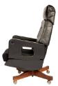Physical DescriptionHigh back desk chair upholstered in black leather with a cushioned head rest and two decorative buttons on seat back. The seat is upholstered in black fabric. There is an ashtray inset in the right armrest. The chair swivels on wood legs set on castor wheels.