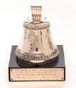 Physical DescriptionSilver cast Freedom Bell, a symbol of American support for Berlin and German-American friendship. The bell is decorated in bas relief with five human torch bearers with arms out stretched, holding a torch in their left hands and grasping the adjacent torch with their right hands. The figures are bordered by a running leaf and berry pattern above their heads and an inscription in raised lettering that reads: "That this world under God shall have a new birth of Freedom." The bell has a grooved loop handle and sits on a black lacquer base. A silver plate nailed to base is engraved with a presentation inscription: The President of the United States of America John Fitzgerald Kennedy als Zeichen herzlicher Verbundenheit Marz 1961 Willy Brandt Regierender Burgermiester Von Berlin.