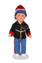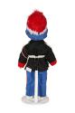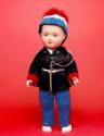 Physical DescriptionMale doll with rubber body dressed in Palace Guard uniform: white cotton shirt, black tie, black felt jacket, blue felt trousers with red stripe down leg, and red and white citation cords on left shoulder and front. He wears a bright blue helmet with red and white feathers on top.