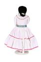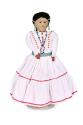 Physical DescriptionFemale Native American doll with a stuffed cloth body and leather hands. Doll is dressed in a white velvet dress with red braided trim belted with a turquoise and copper ribbon. Bodice of dress is decorated with sequins and beads. She wears a beaded necklace and earrings.