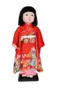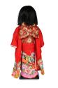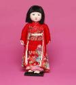 Physical DescriptionJapanese female doll with bisque body. She wears a Kimono of red and gold multicolored print crepe with a yellow and red brocade Obi. She has a small brocade covered book in the folds of her robe.
