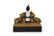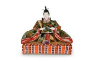 Physical DescriptionJapanese male emperor doll (a) in seated position with wood composition face and wood hands. Doll is wearing a multicolored brocade costume and holds sword in one hand (c). He sits on a straw mat covered wooden base (b). Part of a set of 15 dolls set for Hina Matsuri (Girls' Day) altar that includes: Emperor, Empress, 3 Ladies in Waiting, 5 Musicians, and 2 Ministers and accessories. See MO 63.4843.1-15.