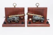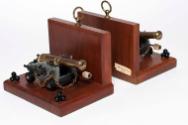 Physical DescriptionA pair of L shaped wood bookends adorn with handmade, working replica models of the USS Constitution ship's cannons. The cannons are a small scale model of 24-pound long guns mounted on sliding carriages, complete with ramrod and cannon balls.