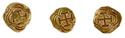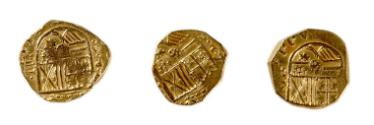 Physical DescriptionThree irregularly shaped gold hammered coins, denomination 2 escudos. Obverse is stamped with the crowned Hapsburg coat of arms. To the left of the coat of arms is the mint mark "NR" for "Nuevo Reino de Granada" and the assayer mark "A" for Anuncibay. The reverse shows the Jerusalem cross enclosed by four doubled arcs, fleurs-de-lis extend inward from the junctions of the arcs, with large annulets above the junctions. The surrounding legend (if complete) would read PHILIPUS III c. c. HISPANIAURUM REX."