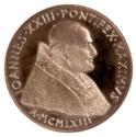 Physical DescriptionObverse depicts Pope John XXIII facing proper right, reverse depicts Pope sitting on papal throne with numerous people in attendance, reads "Salvtiferam orbi Pacem Proposvit/10-V-63". Stored in red and gold-colored presentation box featuring Papal seal