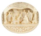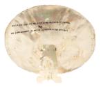 Physical DescriptionOval shadow box with a two dimensional nativity scene. Figures are made of wood overlaid with mother of pearl and set into a niche. A kneeling Mary holds Jesus, behind her are two shepherds at the right, a figure of a woman with a basket on her head stands in the background on the left. The figures are flanked by two columns. The outer edges of niche are decorated by an ornate floral motif. The word "Bethlehem" is etched beneath the central figures. Easel back inscribed in ink "PRESENTED FROM HIS MAJESTY KING HUSSEIN OF JORDAN/ TO/ MR JOHN F. KENNEDY JR. ON THE OCCASION OF HIS BIRTHDAY."