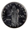 Physical DescriptionSilver 50 lire coin featuring image of Pope John XXIII facing proper right on obverse. Image of woman holding an anchor with "Spes" (hope) and "Citta del Vaticano"on reverse. Coin came in white and gold box with 8 other coins, box has gold papal seal insignia on cover.