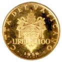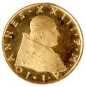 Physical DescriptionGold 100 lire coin featuring image of Pope John XXIII facing proper right on obverse. Image of Papal Seal insignia and "Citta del Vaticano"on reverse. Coin came in white and gold box with 8 other coins, box has gold papal seal insignia on cover.