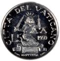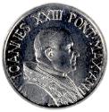 Physical DescriptionAluminum 5 lire coin featuring image of Pope John XXIII facing proper right on obverse. Image of woman kneeling holding a sword and the scales of justice with "Iustitia" (justice) and "Citta del Vaticano"on reverse. Coin came in white and gold box with 8 other coins, box has gold papal seal insignia on cover.