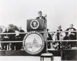 Physical DescriptionBlack and white photograph of President Kennedy standing at podium making commencement address at American University in Washington, D.C. Four men in academic robes are seated behind him.