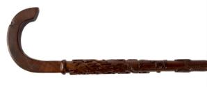 Physical DescriptionCrook handle walking stick hand carved by using a pocket knife from Myall wood treated with no polish or dye. The shaft is inscribed in raised letters: To John F. Kennedy President of (a map of the USA enclosing the American eagle with wings outstretched) from (a map of Australia enclosing the date) 1963. The upper part of the cane is carved with a pair of clasped hands symbolizing the friendship between the United States and Australia. Below the inscription are a kangaroo with a joey in her pouch, a lyrebird and a platypus and below them the stick appears to disappear into the open mouth of a snake. The Cane is contained in a cedar wooden case with a kangaroo skin cover, a bust of the late President Kennedy is carved inside the case with the dates of his birth and death. Case has a St.Christopher key for lock.