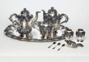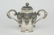 Physical DescriptionTea Set decorated with a repousse lotus flower motif. Hammered silver sugar bowl with lid and two scroll handles.