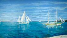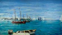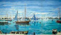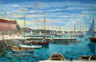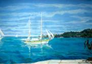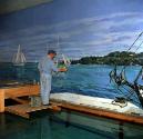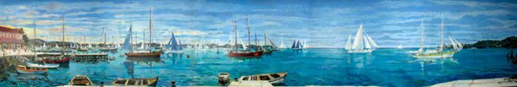 Physical DescriptionOne of five sections of a 97' long panoramic mural commissioned to decorate the White House swimming pool room. Maritime scene shows the port of Christiansted, St. Croix, in the Virgin Islands. Building with striped awning and dock with people at far left, body of land at far right, boats moored in foreground, numerous sailboats on the water. Joseph P. Kennedy's boat, the "Marlin", is represented at the right. Semaphores on other boats spell out names of Kennedy family members. Signed by the artist at lower left.