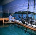 Historical NoteThe mural, commissioned to decorate the White House swimming pool room, is a 97 foot long panorama of the port of Christiansend, St. Croix, in the Virgin Islands. The artist, Bernard Lamotte, selected the subject based on President Kennedy's affinity for boats and the water, and is a testament to the Kennedy family. Joseph P. Kennedy's boat, the "Marlin", is represented, as well as the names of Kennedy family members in the semaphore of other boats in the harbor.