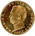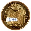 Physical DescriptionCoin struck in honor of Prince Rainier III of Monaco (part of a set of four). The coin has profile of Prince Rainier on obverse and the Royal insignia with "5F" and "Deo Juvante" (with God's help) stamped on reverse.