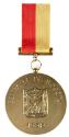 Physical DescriptionGold medallion with relief of Gonzolo Ximenez, Spanish Conquistador and founder of Bogota in center. The reverse is engraved "Santa Fe de Bogota" with a crest in center and "1538" at lower edge. The medallion hangs from a yellow and red grosgrain ribbon.