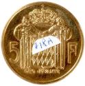 Physical DescriptionGold coin struck in honor of Prince Rainier III of Monaco. The coin has a profile of Prince Rainier on the obverse and the Royal insignia with "5F" and "Deo Juvante" (with God's help) stamped on the reverse.