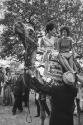 For her state clothing Jacqueline Kennedy generally avoided prints, preferring the impact of strong solid colors. In this rare exception she chose a pointillist pattern that, seen from afar, blends into an even more intense hue that a solid color could be expected to achieve- an ideal choice for the First Lady in the flamboyantly dressed throng that greeted her in Rajasthan. She also wore the dress for a camel ride with her sister on the grounds of President Mohammad Ayub Khan's residence in Karachi. Because of their skirts both women had to sit sidesaddle, making their ride even more unsteady.