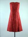 Physical DescriptionA sleeveless dress in scarlet, orange and hot pink printed and ribbed silk matelasse. The dress is a shell with an A-line skirt.