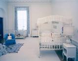 Written in black ink at the top of the page is Baby & Nurse's Room. A large fabric swatch of blue and white chintz with rosebud print for the valances is glued to the center. Below is a fabric swatch of cream organdy silk embroidered with flowers for the undercurtains.