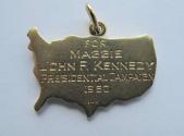 Physical Description14K gold Charm in the shape of the United States. Front of charm stamped with outlines of 48 states. Engraved “FOR/ MAGGIE/ JOHN F. KENNEDY/ PRESIDENTIAL CAMPAIGN/ 1960” on back.