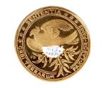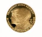 Physical Description.900 gold medal commemorating President John F. Kennedy's state visit to Germany. The obverse of the medal has left facing profiles of President Kennedy and Chancellor Konrad Adenauer and is embossed with Prasident John F. Kennedy/ Bundeskanzler Konrad Adenauer 1963. The reverse depicts a bird of peace holding an olive branch and is inscribed around edge "Sententia - Pax-Labor-Panis - Orbi Terrarum."