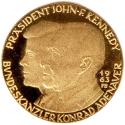 Physical Description.900 gold medal commemorating President John F. Kennedy's state visit to Germany. The obverse of the medal has left facing profiles of President Kennedy and Chancellor Konrad Adenauer and is embossed with Prasident John F. Kennedy/ Bundeskanzler Konrad Adenauer 1963. The reverse depicts a bird of peace holding an olive branch and is inscribed around edge "Sententia - Pax-Labor-Panis - Orbi Terrarum."