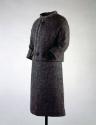 Physical DescriptionA suit in salt-and-pepper wool tweed after spring-summer model number 3270 by Hubert de Givenchy. The understated flecked wool jacket has a fringed neckline and front lapel with two large plastic buttons down center and two flap pockets at sides. The 3/4 sleeve jacket is paired with a matching pencil skirt.