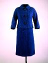 Physical DescriptionA two piece suit with skirt and jacket in blue and black checked wool tweed. The jacket has a collar and three buttons down the center front with two notches at the hip.