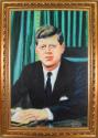 Physical DescriptionOil painting of President Kennedy seated at a desk with green drapes in the background.