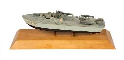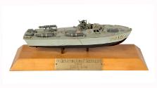 Physical DescriptionPlastic model of PT-109, mounted on a wooden base. The brass plaque on the base is inscribed "Senator John F. Kennedy/ From Navy Log".