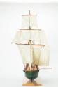 Physical DescriptionShip model of a Norwegian sloop called the "Restaurationen". The ship is rigged with cotton masts and has a wood hull painted green and black. This sloop has a single mast with mainsail and jib. The "Restaurationen" was the first Norwegian immigrant ship sent to America.
