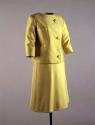 Physical DescriptionA suit in pale yellow silk-and-wool Alaskine with jacket and an A-line skirt. The boxy jacket is collarless and has three fabric covered buttons, off center closure and an off center pocket to balance. The skirt is A-line with a side zipper.