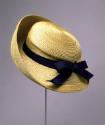 Physical DescriptionNatural colored straw hat with an upturned brim and a navy grosgrain ribbon tied at the back of the hat in a bow.