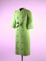 Physical DescriptionA double breasted coat of pistachio green wool boucle with a mock collar, 3/4 sleeves, and a belted waist. Twelve buttons on front lapel accent the line of the coat from collar to hem.