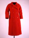 Physical DescriptionA double breasted long scarlet wool coat (Model number 2680). Givenchy transformed the double-faced coat, using the welted seams to describe a subtle inverted goblet shape that curves from an Empire waist.