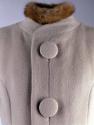 Physical DescriptionA beige knee length wool coat with fur trim around the neckline. The coat has two large buttons down the front with two side pockets at the hip.