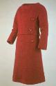Physical DescriptionA two-piece day dress in dark red wool boucle. This dress (a) has a silk bodice and a wool A-line skirt with a matching jacket (b) with a zipper back closure. Three off-center buttons at side seams tie the jacket to the skirt visually. This dress was reproduced after the fall-winter 1961 dress by Marc Bohan, a French designer for Christian Dior. The dark red boucle is Rodier's wool boucle and the buttons are the buttons of Bohan's original. The dress has a thick chain-stitching outlining both the standaway neckline and the hem of the skirt that was one of Bohan's signatures.