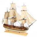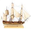 Physical DescriptionThis is a ship model of the "La Flore", one of the 18th century, 28 gun frigates in French Admiral D'Estaing's fleet 1778-1779, that fought for the Americas during the Revolutionary War. She was an American built ship purchased by the French in 1784. This ship model has three fully rigged masts. The two mainsails are furled so that the details of the deck can be easily viewed.
