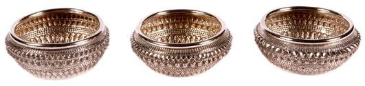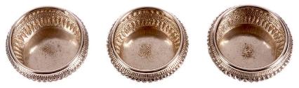 Physical DescriptionThree shallow silver cups with repousse floral motif on the exterior of each. Stored in wooden chest.