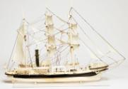 Physical DescriptionModel of a three-masted American Whaling ship with 3 jibs at stern. Sails, deck and hull are carved from whale baleen. Six lifeboats hang from davits. The hull has a black wooden deck with a smoke stack. The rigging for the masts is made of sinew.
