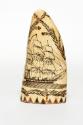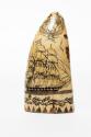 Physical DescriptionEngraved sperm whale tooth featuring the starboard side of a three-masted frigate, flying the swallow-tailed pennant of a commodore at its masthead. Her guns are run out into open ports. Above the frigate is a coat of arms (?) of a fouled anchor over four flags and crossed swords underneath. The reverse is decorated with a frigate flying the long pennant of a government vessel in commission, surrounded by foliage. There are small red flowers and geometric designs along the bottom edge.