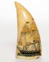 Physical DescriptionEtched whale tooth showing a three-masted frigate with its sails semi-unfurled on the front side. Etched on the reverse is a whaling scene featuring a boat with several fisherman towing a whale with the words "Haul Line" etched in cursive above. Etched below the whaling boat is a shore scene with a tree, foliage, a ship moving up the channel next to a fort and ships at sea in the distance.