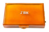 Physical DescriptionAmber minaudiere with latch closure. In center of lid are silver initials "JBK" inset with diamonds. Mirror compartment on interior of lid with separate compartments for makeup, powder, lipstick, etc.