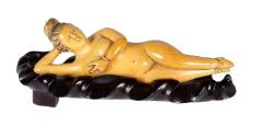 Physical DescriptionIvory statue of a reclining female nude, posed with one arm raised behind head and the other covering her breasts. Statue was used as model on which women could point out their ailments to doctors. Statue fits into a wood base.