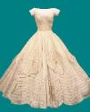 Physical DescriptionA wedding dress of ivory colored silk with off-the-shoulder cap sleeves, a back zipper closure, and a portrait neckline. The bouffant skirt is decorated with interwoven bands of tucking to create rosettes with tiny wax flowers applied to center. The bottom hem of the gown is scalloped. A blue bow is sewn to the bottom ruffle of the underskirt. Ann Lowe label is sewn inside the front waistline of the dress.