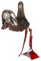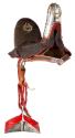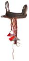 Physical DescriptionBrown leather saddle with red metal stirrups and wool cinch. The horn of the saddle is decorated with hammered silver appliquéd with a gold crescent and star, the symbols from the flag of Libya. The leather backrest and hammered silver stirrups also are decorated with the crescent and star motif. A pair of decorated stirrups are attached to the saddle with red leather straps. The cinch is made of a cream colored wool with a woven red, purple and orange stripe.