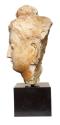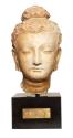 Physical DescriptionGandharan style stucco head of Buddha with wavy hair swept upwards and terminating into an ushnisha. Face has arching eyebrows and heavy half-open downcast eyes. The mask-like face of this, and other Buddhas from Hadda, have a dryness and regularity which suggest that they were made from moulds. The treatment of the face has slight reminiscences of a Classical ideal combined with the soft fullness of Indian sculptures of the Gupta period.